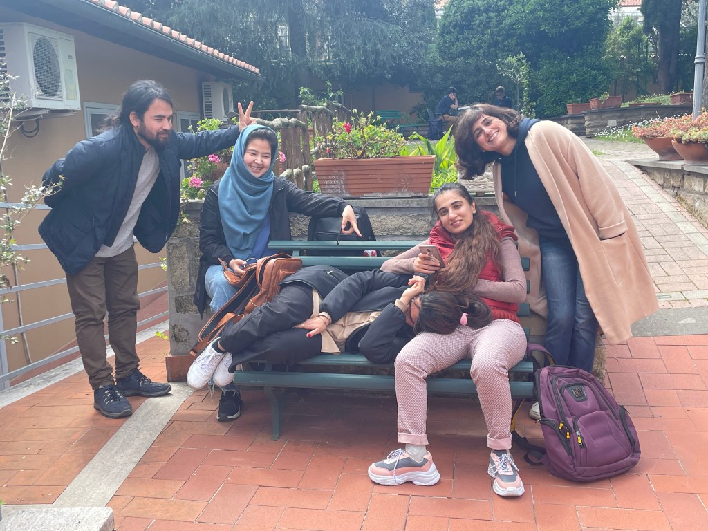 Alina, a Ukrainian refugee fashion designer turned feminist activist, was one of the eleven refugee students who took my class. For her final project she imagined her own journey from Inferno to Paradiso through the lens of the Italian bureaucracy. In the short film she made for the course, Paradise of Exiles, she shows herself moving from the dark wood (she literally, set off at 2am to shoot in woods outside of Rome) followed by the Purgatory of refugee status determination and the eventual Paradise of finding peace in Rome’s art scene. She filmed the final scenes at an exclusive shoot at the Galleria Borghese where my friend Stefania Vannini is a curator. She looks resplendent with her red hair against the green walls. I’m there in the background cheering her on.