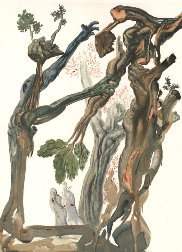 Dante describes the tortured woodland as infested with harpies who abuse the souls by ripping off their branches. In an act of symbolic retribution, it is said that when each of the blessed and damned will return with their body from the Last Judgment, those damned for suicide will not re-inhabit their bodies but instead hang them on their branches, both because they denied them in their final act of life and as a reminder of what they denied themselves. Salvador Dalí depicted this starkly in one of his many paintings of the Commedia.