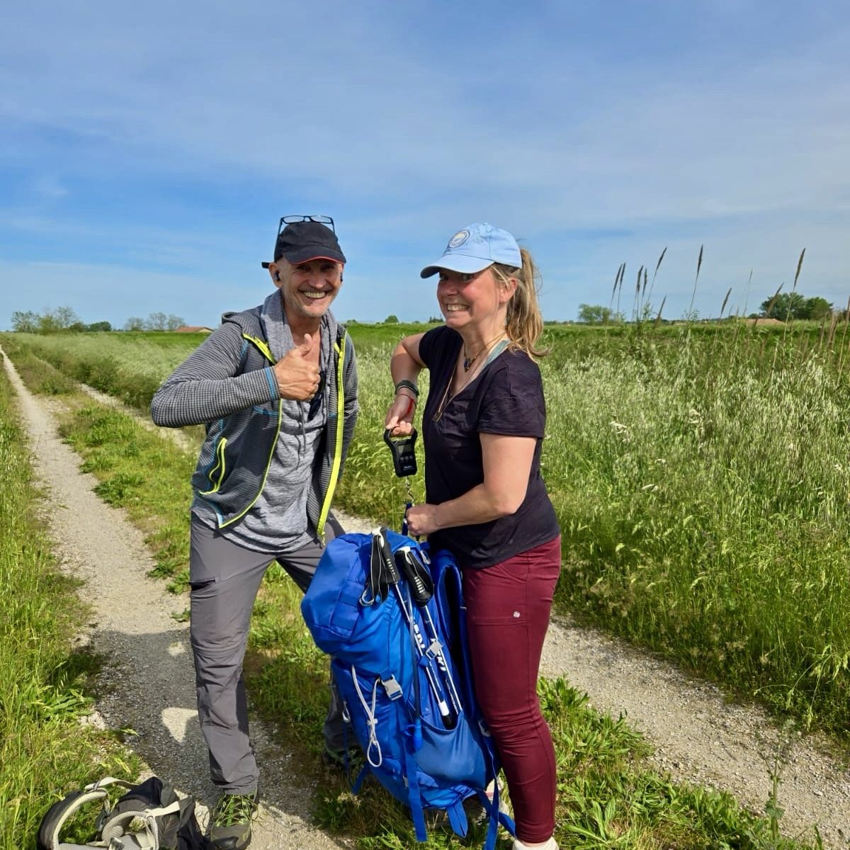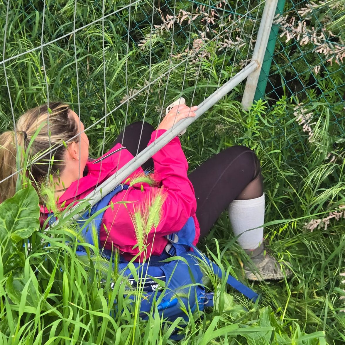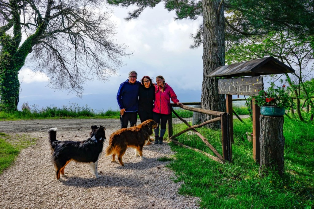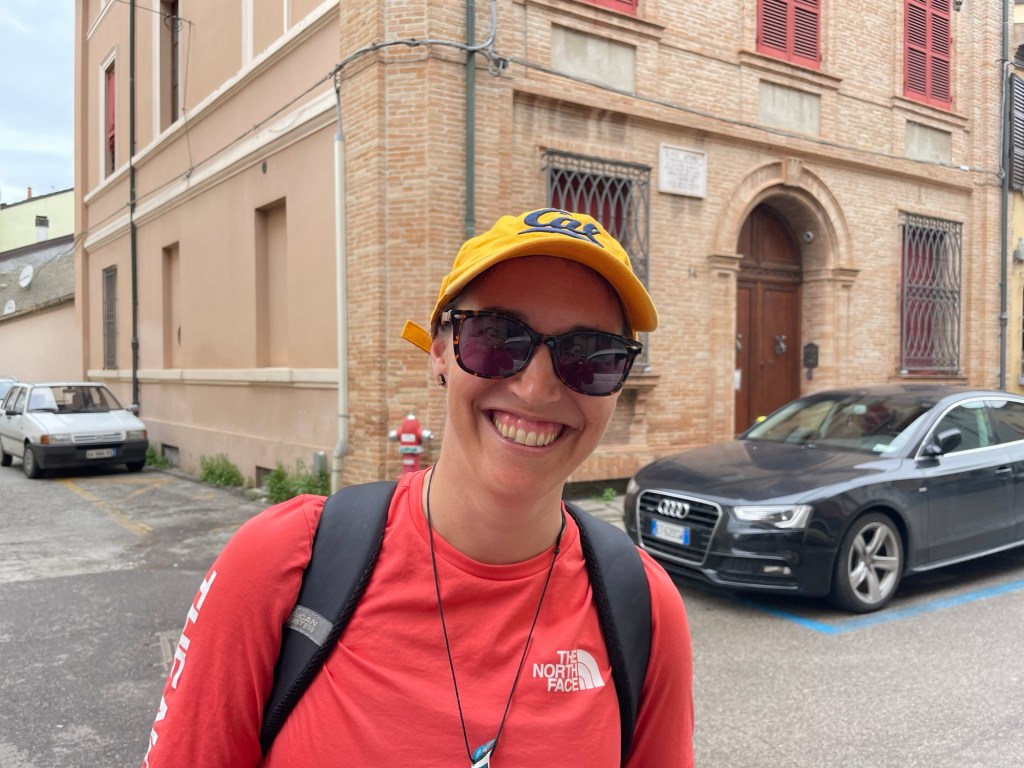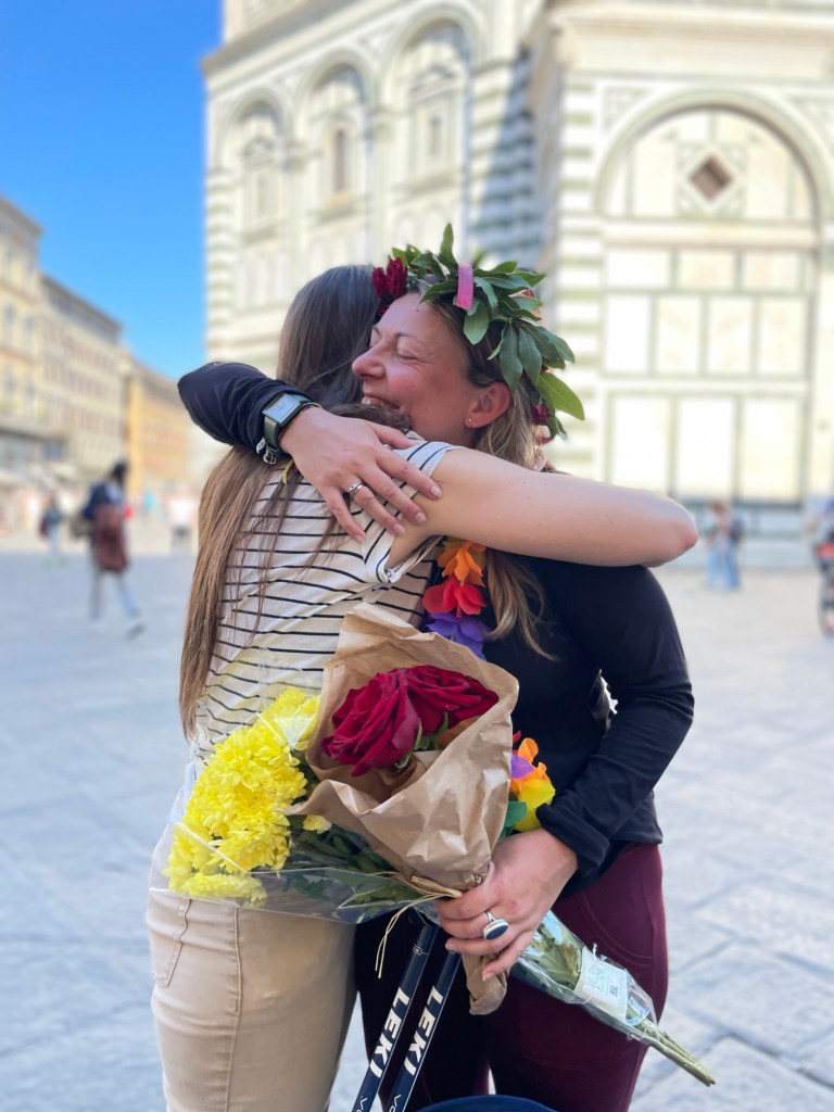 Turning the corner, Kelsey and Alina with whom I’d shared parts of the cammino were there to greet me with a huge hug. Kelsey had made me a laurel crown with roses which she placed upon my head – they smelt magnificent. Alina who was wearing characteristically fashionable unmatching earrings squirted at me with champagne in the traditional fashion of Italian graduations. I sent a picture to Giordano, the founder of the trail.