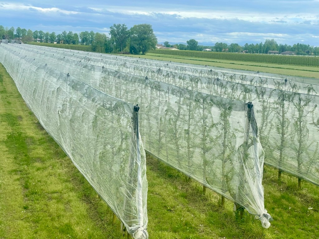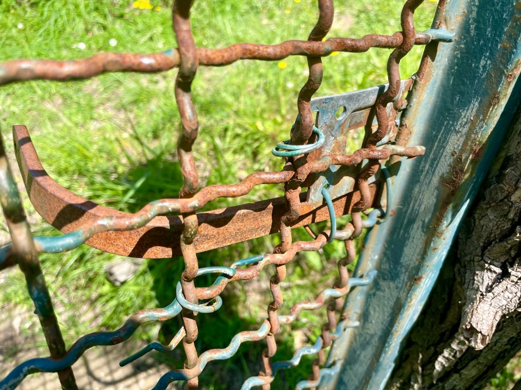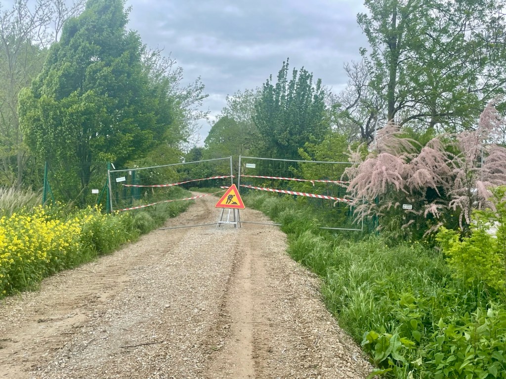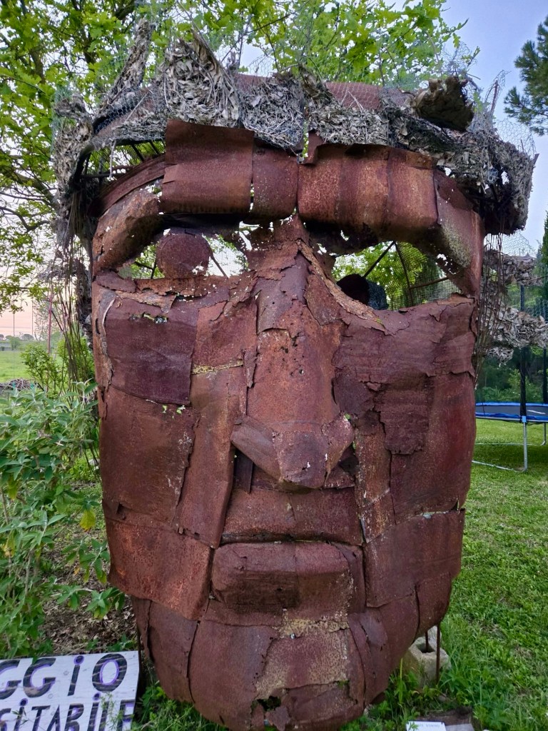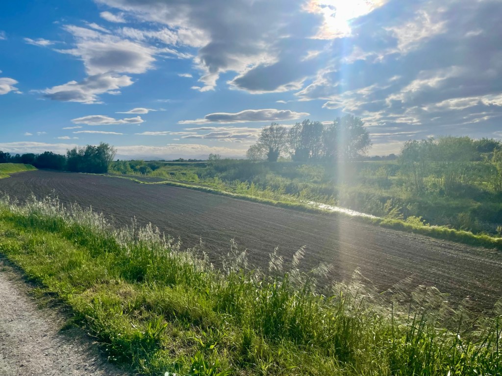 The recreational path soon gave way to allotments which featured a variety of vegetables and flowers that were being carefully attended to by a diverse group of local citizens. It was the first time I’d seen yellow irises, and here was a line of Romagnolo artichokes in their characteristic bruised purple and green.