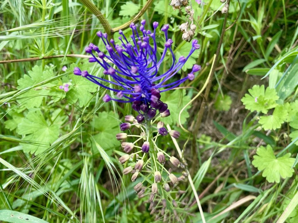 I could feel the weight of not having slept with every step up the woodland pass but the shadow of the trees was merciful. I was rewarded by the sight of a kaleidoscope of tiny flowers. Here some purple gromwell creeped along the ground, sending out long trails of dark green matt leaves sprinkled with gentian-blue flowers. And there were pink prongs of common sainfoin. I recalled how Dante described being drawn to beauty in Purgatorio, canto 18: