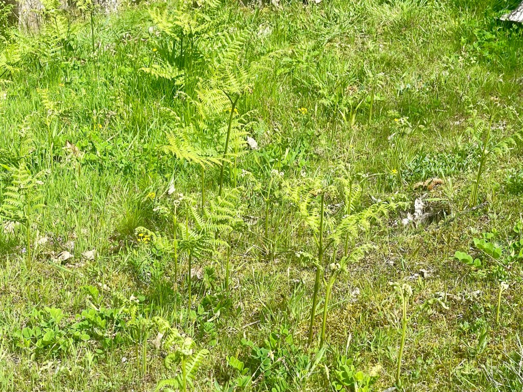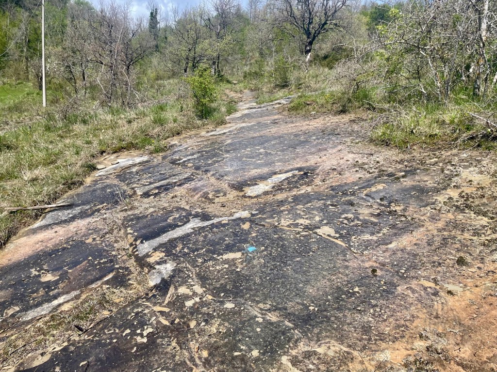 As I exited the woods, I passed a tennis court which seemed unusually located on the rocky terrain. Two men were working out how to get a van along the path. The one who seemed to be in the more authoritative position was wearing blue overalls. Now it was nearly 12 o’clock and the sun was beating down on me. Soon I’d stop for my lunch of the remaining pizza.