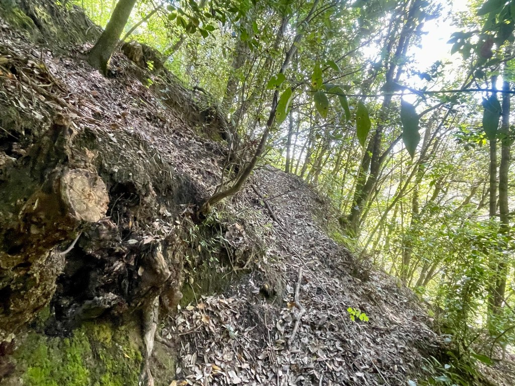 I passed a church on the right and took a wrong turn which afforded a beautiful view back over the city. I then retraced my steps to take the steep climb of the wooden bank off to the left of the road. The foliage was intruding onto the path in thick tendrils causing me to duck and dive. A spider web was suspended in the sunlight, diaphanous.