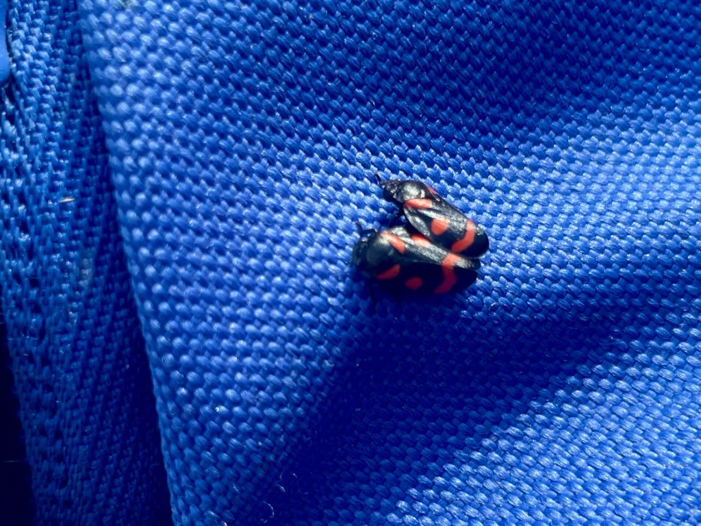 A fellow hiker who looked North American was walking the other way. I saluted her – she was as pink as I was in the afternoon sun. I noted that one of the cuts on my hand might be infected and applied some ayurvedic balm. A bright green caterpillar dangled on a thread.