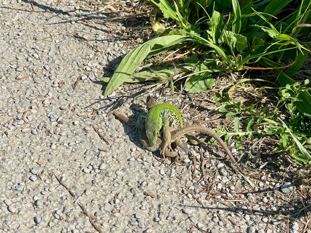 And now I was in the city in earnest. The dum dum dum of music with a heavy base played out from somewhere to my right and several joggers ran topless in the sun. Tour coaches lined the streets with signs reading promises such as ,’Experience Pisa and Florence in a Day.’ I stopped to observe a lizard biting another’s tail.