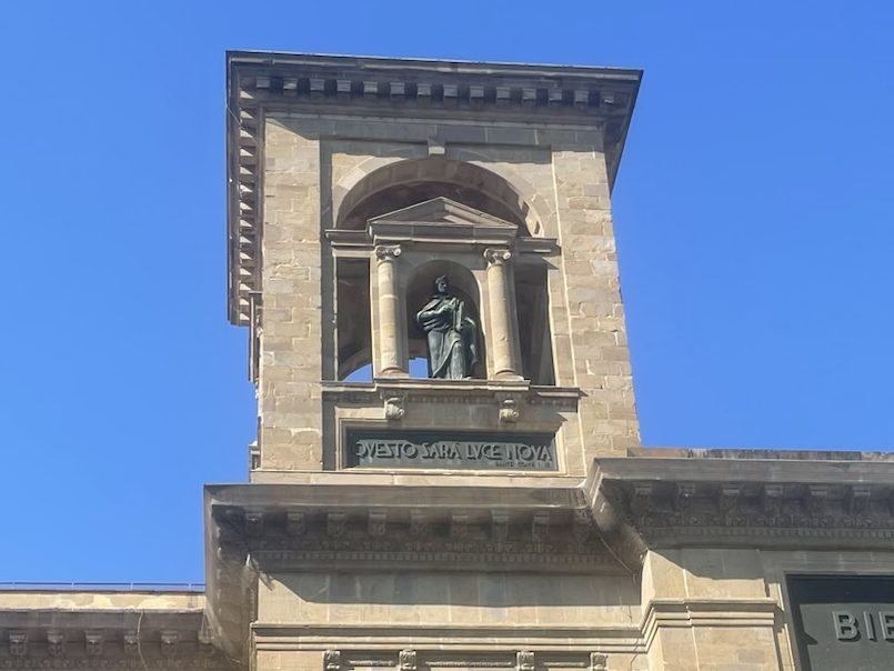 I passed the national library with its Dante sculpture and quote from his political treatise Convivio, ‘let this be new light’. Then came the Galileo Museum, shortly after which I turned right at the Uffizi galleries. Over the heads of all the eager street artists, I spied a second Dante sculpture which depicts him pointing at himself in a gesture of self-importance and pride. Here in stone, he has been bequeathed the laurel crown of poet that he so desperately wanted to return to wear in person before he had died, aged 56, in exile. I thought of his bones, lying in Ravenna.