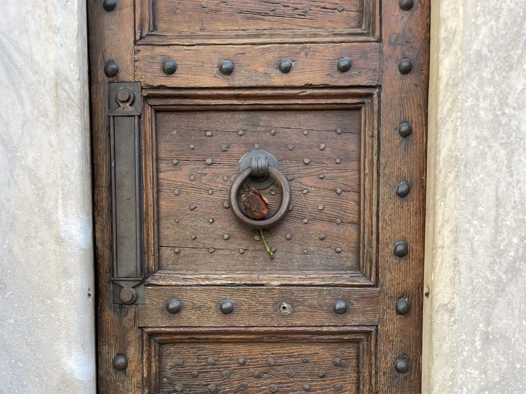 I thought of how struck I had been at the age of 15 when I had first seen the mosaics inside and of the copy of Christ’s head that I had rendered that was likely still situated in the paving of my old secondary school. I thought about the first time I had read the words of Dante and felt seen and understood in my sense of being lost. The sobs immediately came. I placed my hands upon the flank of San Giovanni and tucked the rose I had brought from Ravenna in the doorknob. Dante’s dream had been to return as a poet and now, in some ways, symbolically, I had brought him back.