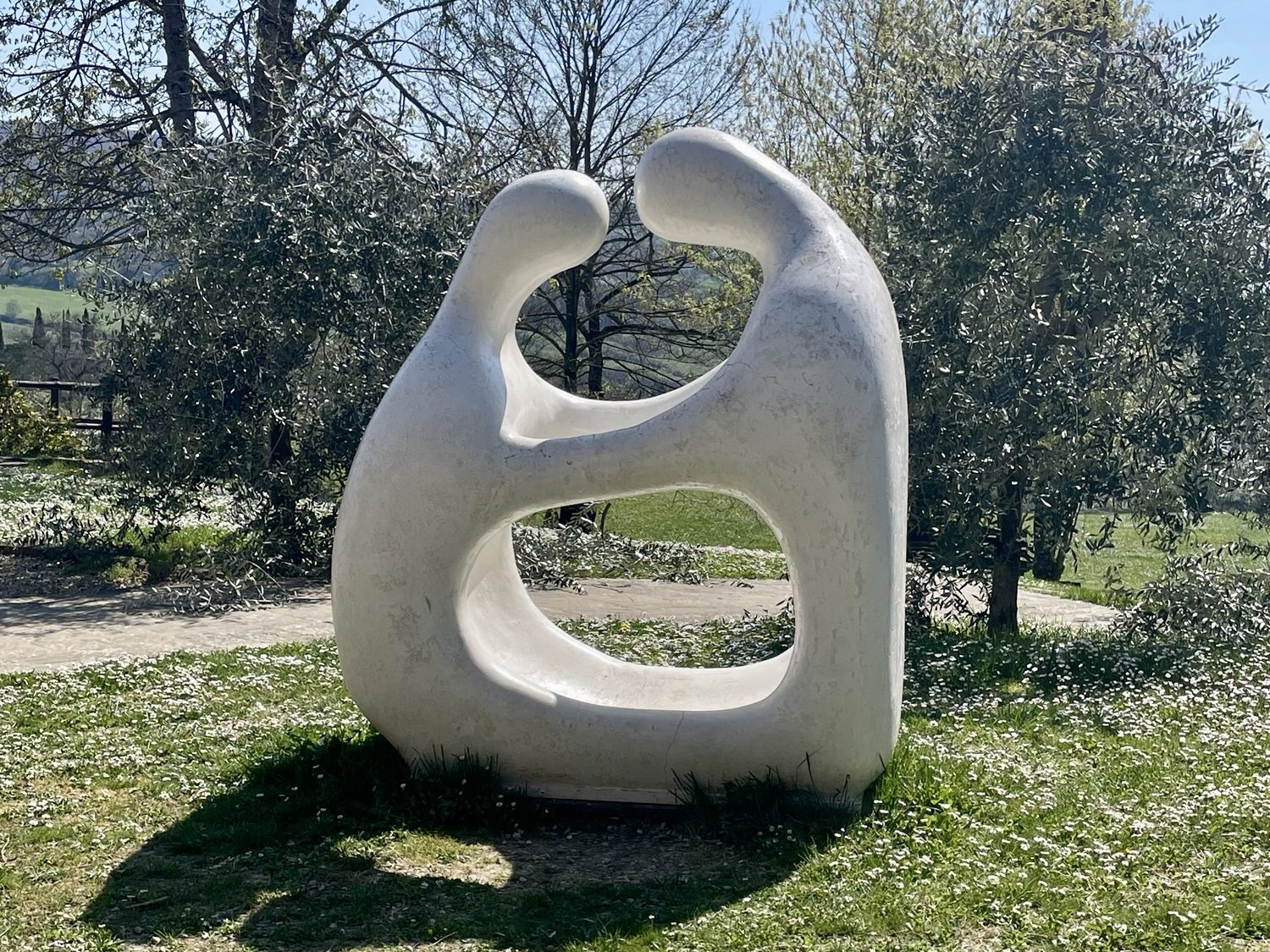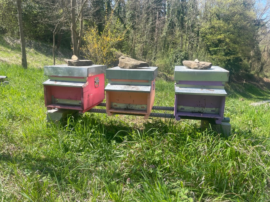 There was a horse medallion on someone’s house and statues of little angels and a chicken rendered in bronze. There was plenty of space for both me and the cars on the road. A chain of colourful beehives lined the hill like a Lego brick house under construction.